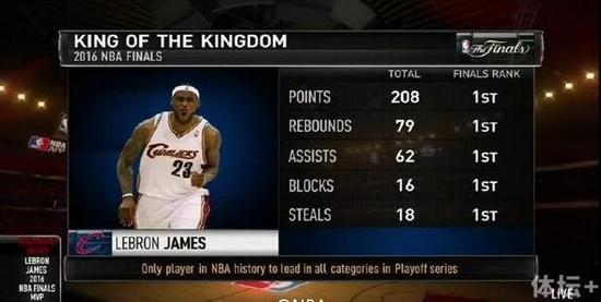 詹姆斯在上赛季总决赛更是打出代表作,场均得到29.7分、11.3个篮板、8.9次助攻、2.3次盖帽和2.6次抢断,五项数据都排名两队第一。詹姆斯完全统治了总决赛。全力詹就是这么可怕。