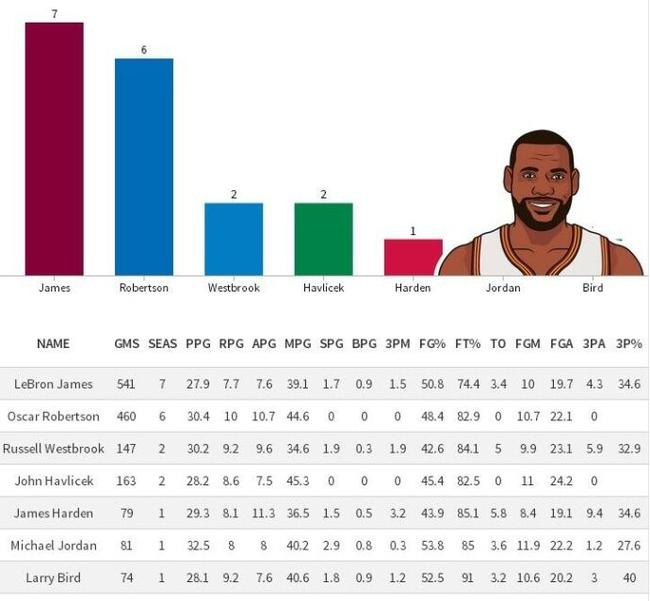 而另外一位三双大王,本赛季打出现象级表现,破了“大O”尘封55年纪录的拉塞尔-威斯布鲁克,职业生涯只有两个赛季拿到至少25+7+7的数据,这一成绩也能排名历史第三。