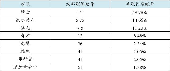 而在东部冠军赔率方面,骑士目前也以1.41遥遥领先,凯尔特人虽排在第二赔率却高达5.75,至于步行者更是1赔41险些垫底。通过公式换算,我们可以轻松得出在博彩公司眼中骑士夺得东部冠军的赔率都达到59.78%,至于首轮淘汰步行者自然更不在话下。(好学)