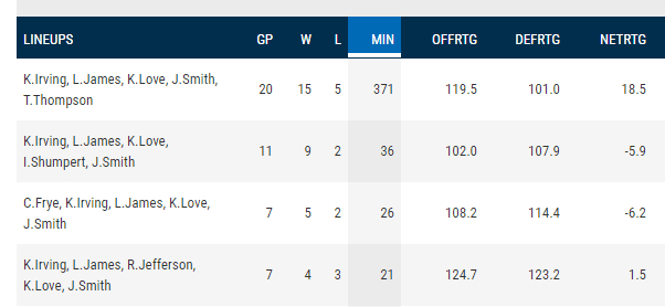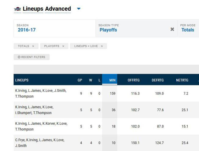 这是去年骑士季后赛中他有勒夫的阵容的防守效率,同样是出场时间前四的阵容。是不是这个百回合失分看起来,跟你们印象中的更加接近?