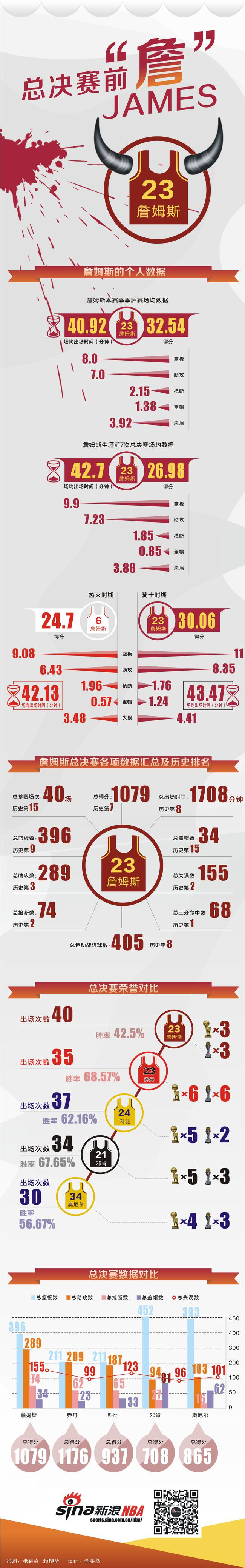 这是勒布朗-詹姆斯职业生涯第8次进入总决赛,也是他连续第7年进总决赛,总决赛当中的詹姆斯,到底有哪些厉害的数据?看完下面这张图表,你就知道了: