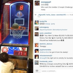 视频显然摄于一处电子游戏广场,杨那个站都还站不太稳的宝贝儿子站在投篮机前,有模有样地捡起皮球,投向篮筐。随着儿子接连出手命中,杨也显得非常兴奋,不停地为爱子加油打气。