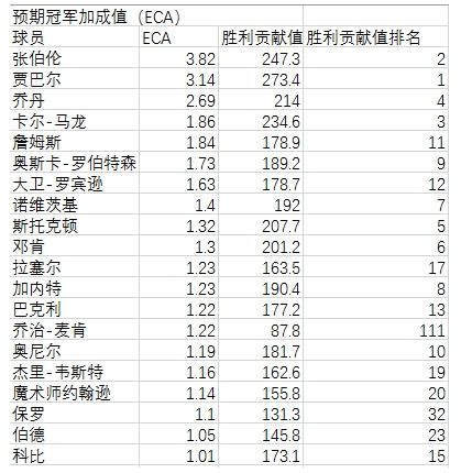 预期冠军加成值:科比排名第20