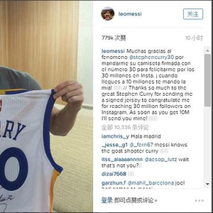 “非常感谢伟大的斯蒂芬-库里为了祝贺我的IG粉丝达到3千万而送给我一件他的签名球衣。等到你的IG粉丝数达到1千万的时候,我也会送给你我的(球衣)。”梅西在IG上这样写道,并且晒出了库里的签名球衣。