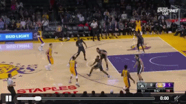 湖人第一次换人经常搞砸,有的时候看起来他们轮转就是即兴的——或者因为克拉克森和拉塞尔被别人挡得绝望了。后续的换人可以成为《启斯东警察》级别的恐怖秀(译者注:这是一个早年的默片,以无能警察为原型的喜剧,这里说恐怖秀是反讽)。他们是个差劲的篮板小队——现在如此——在他们内线轮转到去防对方外线时变得更差。湖人在南斯和兰德尔一起打时,丢分不止。