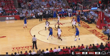 当然霍华德是能够拉出来做掩护的,小乔丹的防守威胁则是距离篮框越远就越小。图2是哈登利用掩护后往左边绕上篮得手,图3是他击地传球给顺下无人盯防的霍华德。而如果快船像图4这样让巴恩斯留意霍华德的顺下,哈登也能把球分给侧翼的射手。他全场送出12次助攻,在牵扯队型方面仍然是巨星水准。