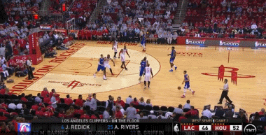 此举优先保护的是巴恩斯免受犯规困扰,快船本来就人少了,再派常规赛每36分钟3.8次犯规的巴恩斯盯哈登实在冒险。他还能因此腾出身来,和火箭的运动型锋线拼协防和造失误。那么雷迪克防得怎么样呢?他至少意识和基本功没问题,像图1跟不住就优先封住左边,能把右边交给小乔丹来应付。
