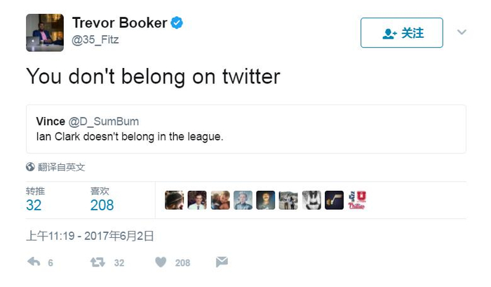 “伊安-克拉克不属于这个联盟。”名为Vince@D_SumBum的球迷写道。对此,克拉克的前队友特雷沃-布克看不下去了,他转发了该网友的推特并评论道:“你不属于推特。”