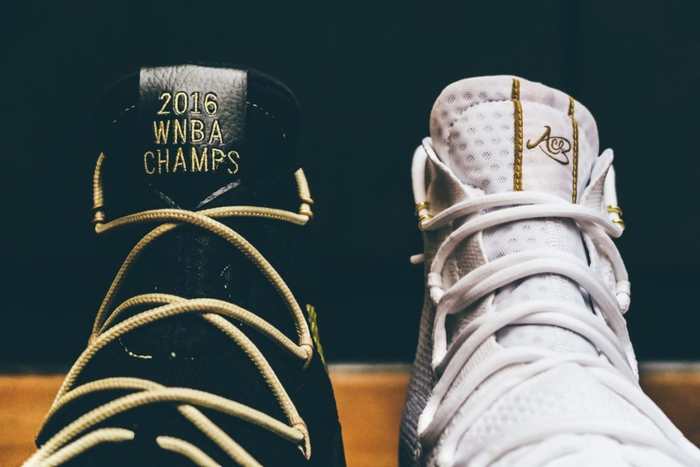 黑金配色则是为常规赛MVP球员Nneka Owgumike打造,灵感来自 MVP 奖杯,黑色鞋身结合金色鞋带和金色三道杠,鞋舌用 "2016 WNBA Champs" 点缀!