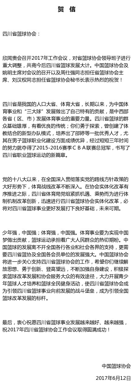 贺信中肯定了四川篮球为中国体育事业和“三大球”发展做出了自己特有的贡献,尤其是仅用了短短三年时间的努力就获得了2015-2016赛季CBA联赛总冠军的成绩,最后衷心祝愿四川篮球事业发展越来越好、越来越强。