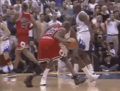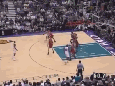 回过头来,爵士仍旧是同样的战术,斯托克顿找右侧腰位的马龙,这次,乔丹果断放弃了自己的防守人,从马龙的视野盲区杀出将球打掉并抢断,盐湖城的球迷在这一刻仿佛看见了魔鬼一般发出哀嚎。