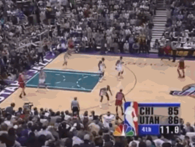 乔丹运球到前场,左侧28尺线加速启动,在左罚球圈顶急停,并且“用左手帮助了一个快要摔倒的人(禅师后来的原话)”,用完美的出手投中两分将比分反超为87:86,5.2秒,爵士喊出暂停。