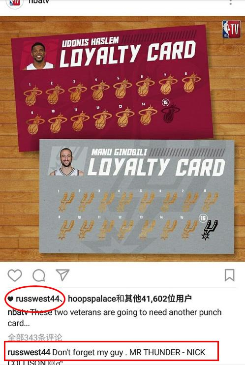 随后威少点赞并回复:“别忘了我的小伙伴,雷霆先生——尼克-科里森。”