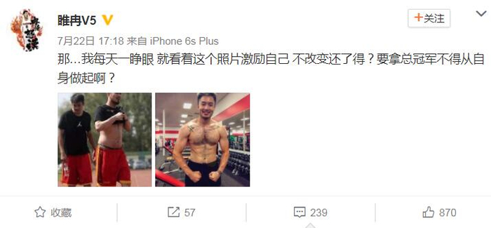 “那...我每天一睁眼 就看着这个照片激励自己,不改变还了得?要拿总冠军,不得从自身做起啊?” 睢冉在微博里这样配文到。