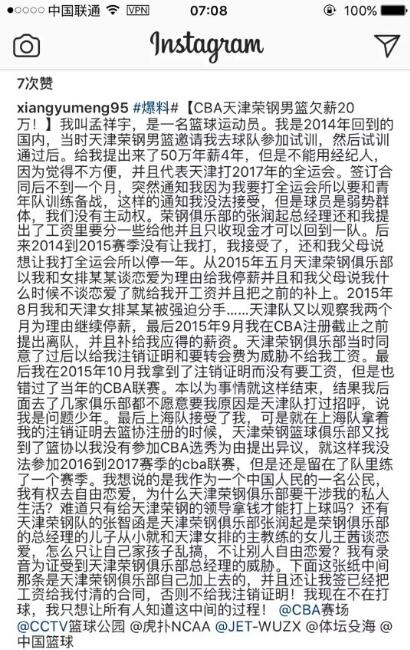 直播吧7月24日讯 今天,内线新星孟祥宇在Instagram上爆料,遭天津男篮欠薪20万,老东家还曾各种阻挠自己加盟其他球队。