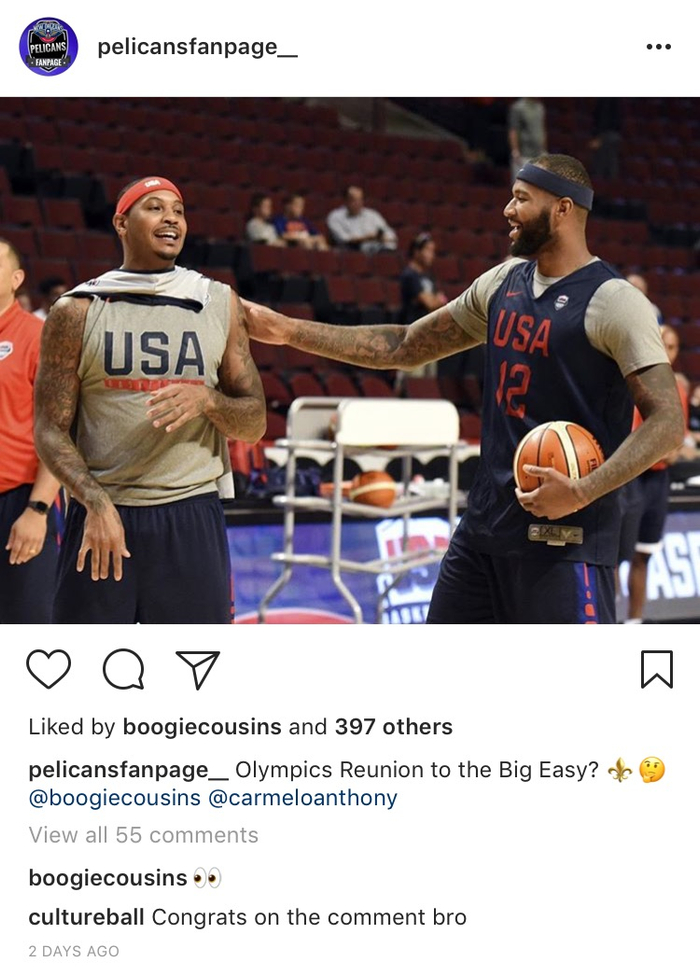 一个叫作“Pelicansfanpage_”的Instagram主页晒出了一张考辛斯和安东尼在国家队做队友时的合影,并写道:“这对奥运会时期的队友在新奥尔良重聚?(big easy是新奥尔良的昵称)”