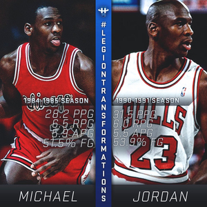 直播吧8月9日讯 美国媒体在推特上晒出一张乔丹新秀赛季和巅峰赛季的数据对比图。