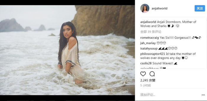 今天,她在社交媒体配了一张自己的照片,并写道:“安佳丽,风暴降生,狼与鲨之母(Anjali Stormborn, Mother of Wolves and Sharks)”。