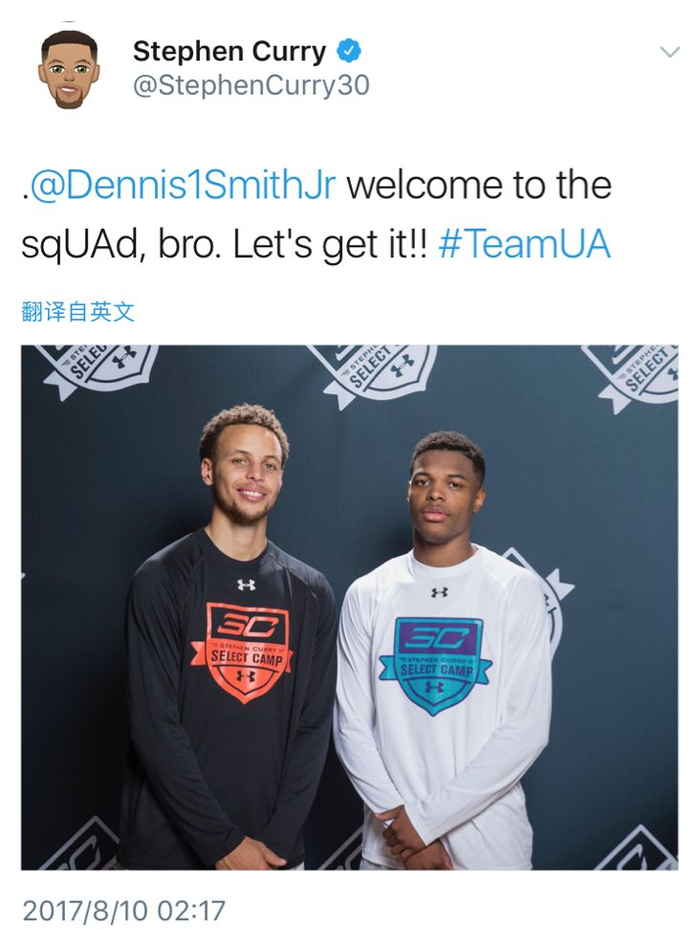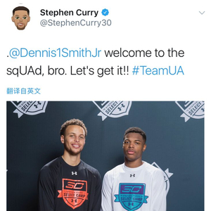 UA篮球头号代言人库里发推欢迎了自己的小兄弟,库里写道:“@丹尼斯-史密斯,欢迎加入UA团队,兄弟,让我们开干吧。”