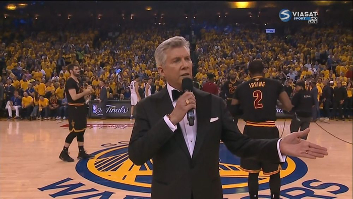 本场比赛勇士仍然请到了Michael Buffer为比赛暖场,ABC仍然没有给他镜头,但是俄罗斯电视台做到了!