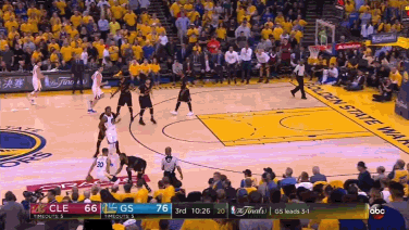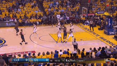第一节5分半钟,勇士队本场比赛第一次祭出库里-杜兰特挡拆,骑士没有选择包夹,杜兰特单打杰弗森命中。