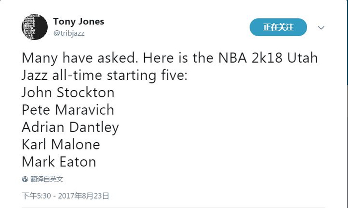 直播吧8月24日讯 据盐湖城论坛报记者Tony Jones透露,NBA2K18爵士队史最佳阵容出炉,由约翰-斯托克顿和卡尔-马龙领衔。其他3人分别是皮特-马拉维奇、阿德里安-丹特利和马克-伊顿。