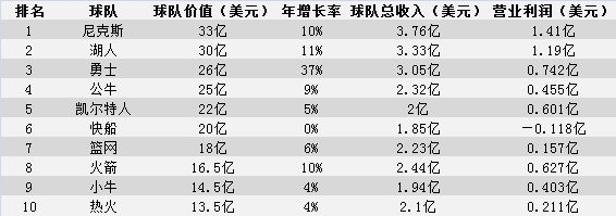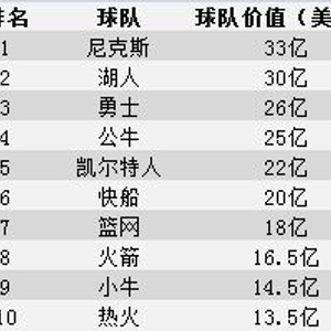 《福布斯》上个月公布了世界体育俱乐部市值排行榜,其中有7支NBA球队入围前50名,分别是尼克斯(第7)、湖人(第9)、勇士(第20)、公牛(第22)、凯尔特人(第30)、快船(第39)以及篮网(第47)。从榜单中可以看出,战绩不是决定NBA球队市值的主要因素,因为市值最高的球队并不是战绩最好的球队(尼克斯和湖人都已经连续几年没有打进季后赛)。
