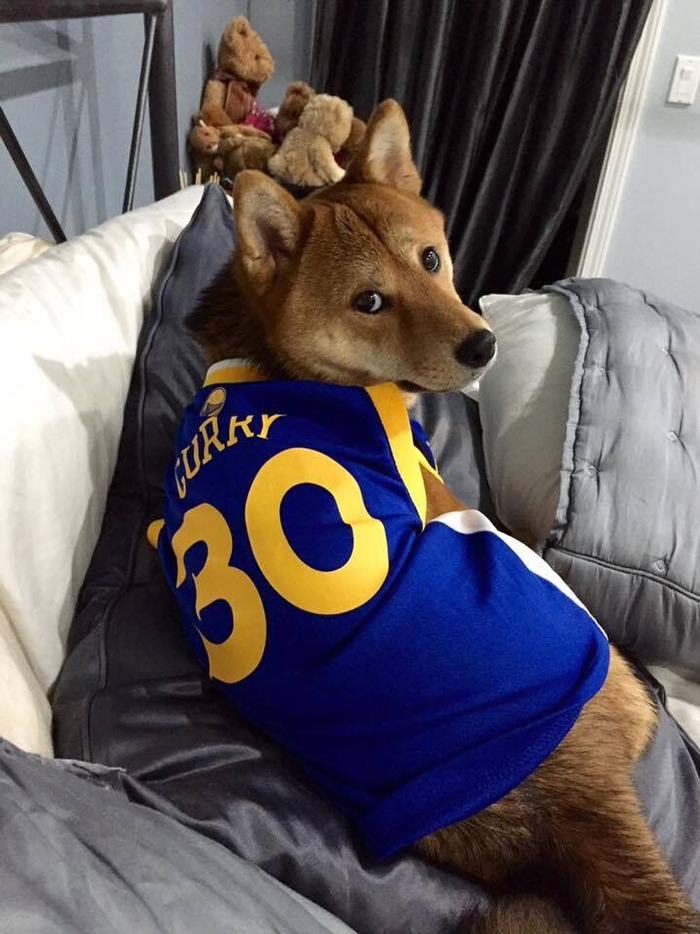 勇士官方晒出了四张小狗图片,第一张图片的小狗身穿库里的30号球衣回头望去。