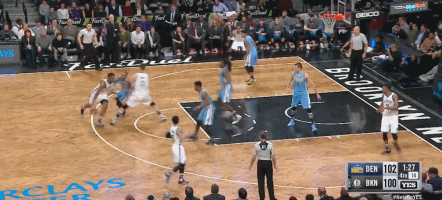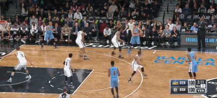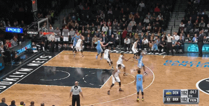 乔-约翰逊和布鲁克-洛佩斯打挡拆,JJ倚住弗耶右手将球一抛,大洛顺势将球放进篮筐,篮网102-102!