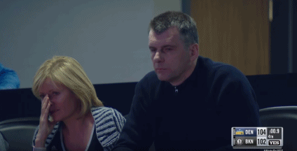 在半兽人命中这一球后,篮网老板普罗霍洛夫直摇头,而旁边的女士也掩饰不住失望!
