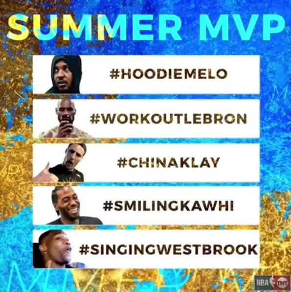 直播吧8月31日讯 TNT在官方IG发布了一个名为“夏季MVP”的评选活动,入选名单的有穿连帽衫的安东尼、训练中的詹姆斯、中国行的克莱、微笑的卡哇伊和唱歌的威斯布鲁克。