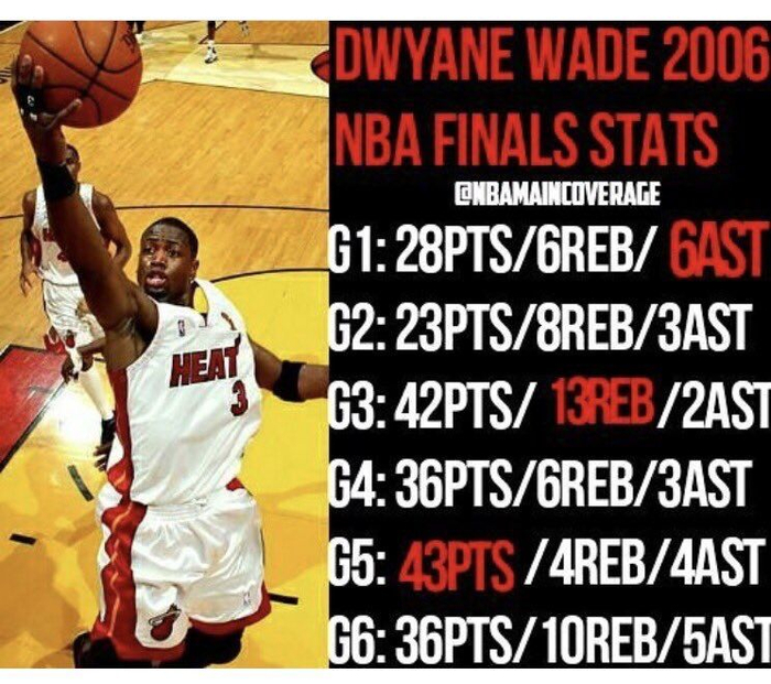 韦德今天在推特上晒出一张照片来回顾当年总决赛热火VS小牛,图片里的内容是韦德2006年总决赛对阵小牛六场比赛的具体数据。