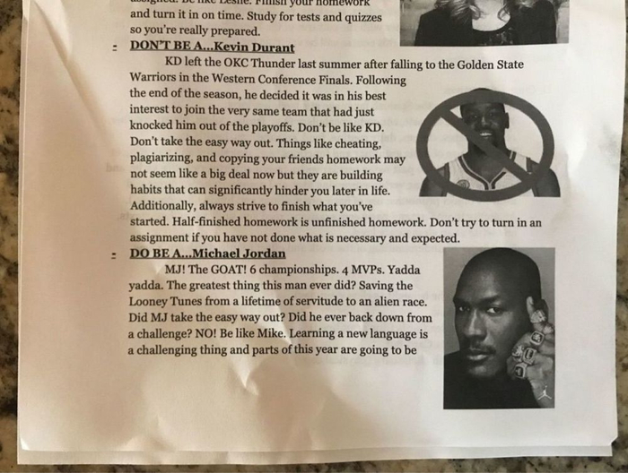 篮球新闻媒体SB Nation发布了一则新闻,俄克拉荷马州塔尔萨市一位教师教育学生不要学杜兰特抄捷径,要学乔丹坚持到底。