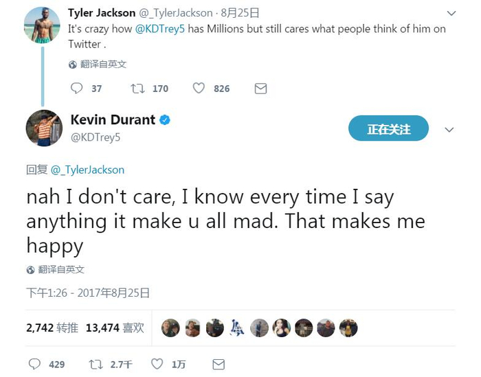杜兰特回复Tyler Jackson说:“不,我不在乎,我只是知道我每次说一些什么事的时候就会让你们很愤怒,而这让我很开心。”