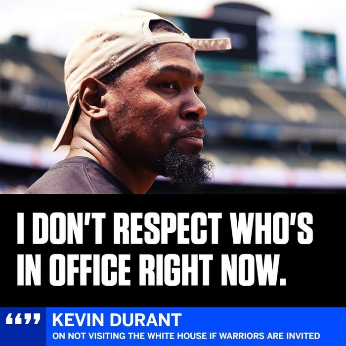 勇士夺得上赛季NBA总冠军,按照惯例他们会获得邀请参观白宫。杜兰特表明态度不会参加白宫行:“不,我不会去的,因为我不尊重那个掌权的人。”
