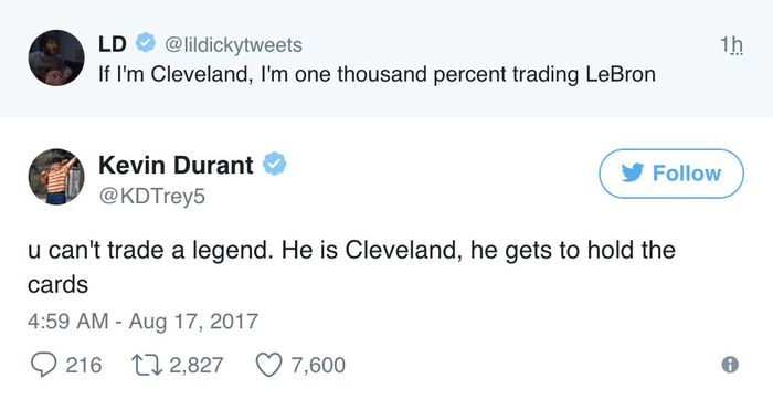 杜兰特为詹姆斯说话:你不能交易一个传奇