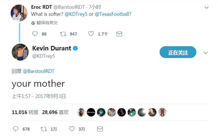 名为@BarstoolRDT的用户向杜兰特提问道:“谁更软弱?是@杜兰特 还是@德州大学橄榄球队?(注:在提问之前,德州大学输给了马里兰大学)”