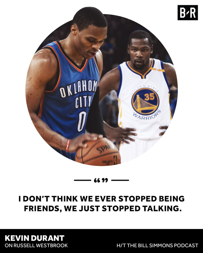 杜兰特在Bill Simmons的播客节目中谈到了他和威少的关系,他说:“我不认为我们之间的友情有过间断,只不过我们停止了交流。”