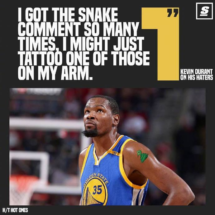 杜兰特提到了许多不喜欢他的球迷对于他的不友好言论,KD调侃到:“我看到很多这样的评论,人们用蛇来形容我,或许我应该在我的胳膊上纹一个蛇的纹身?”(西方人看待蛇,一般都与邪恶有关,圣经中魔鬼就化作蛇引诱夏娃吃智慧果,结果人类的始祖被逐出伊甸园...)