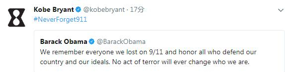 科比转发了前美国总统奥巴马的推特,该推特写道:“我们牢记每一个在911恐怖袭击中失去生命的人,也尊敬每一个捍卫国家保护我们理想的英雄,恐怖袭击不会改变我们的本性!”科比转发了该推特,并配上了#勿忘911的标签。