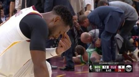 凯尔特人前锋戈登·海沃德在本赛季首场比赛仅几分钟就受了伤并迅速下场。波士顿的医疗团队快速的冲入场内进行固定和急救,而两队的队员则都一脸被惊呆了的表情。
