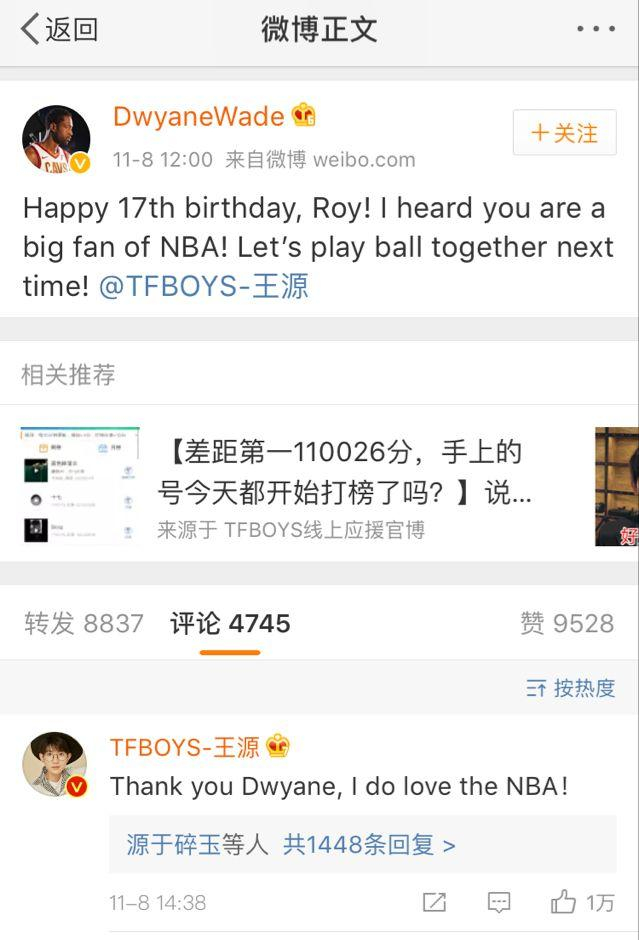 弄啥嘞?韦德微博祝TFBOYS成员王源生日快乐? 新浪综合 2017.11.0900:00 关注 11月8日讯 今日NBA常规赛骑士最终在主场险胜雄鹿结束4连败,这对骑士将士而言是个不错的好消息。然而就在这场比赛结束后不久,骑士球员韦德的微博账号却来半路抢戏了!中午12点,韦德的微博账号发布了一条消息,祝TFBOYS成员王源生日快乐……微博内容如下:“生日快乐,ROY(王源英文名)!我听说你是NBA的忠实粉丝!希望下次有机会能跟你一起打球!@TFBOYS-王源”值得一提的是,王源的微博账号也在该微博下评论道:“谢谢你,德维恩,我确实很喜欢NBA!”(WHAT) 本文来自东方体育