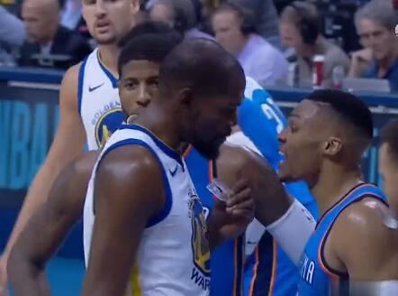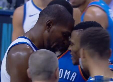 杜兰特和威少自然成为球迷最关注的焦点,俩人比赛中也多次互相对位单打。上半场双方打得平平淡淡,下半场一开始威少就成功抢断杜兰特一条龙暴扣得手,回过头来又抢断库里反击得手,并且造成犯规。精彩的一幕在第三节中段终于上演,杜兰特持球突破,威少把球打出底线,随后俩人开始头顶头互喷起来,最后一人一个技术犯规。