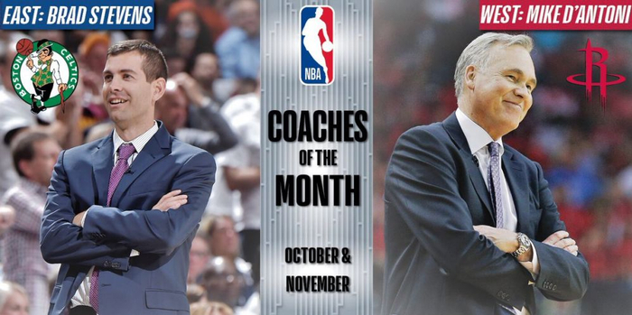 直播吧12月2日讯 NBA官方公布了上月东西部的最佳教练,凯尔特人主帅史蒂文斯和火箭主帅德安东尼成功当选。
