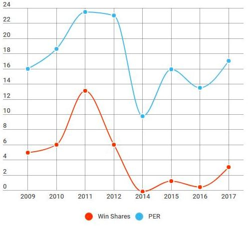 首先让我们明确最关键一点:有些数据(例如这里的PER)衡量球员单位时间的贡献,而其他数据则是衡量这名球员为球队做出的总体贡献和价值,参考因素包括比赛时间(例如win shares)和可替换水平(例如VORP)。在通常情况下,同一种数据可以用两种方式表达:每48分钟的WS值是衡量单位时间的数据,就像统计表正负值BPM(box plus-minus)一样——BPM通常用来计算VORP值。而与此同时,基于每分钟数据得来的PER值也可以用来计算EWA 值(estimated wins added,预计增加胜场数),这是一个衡量球员总体价值的数据。