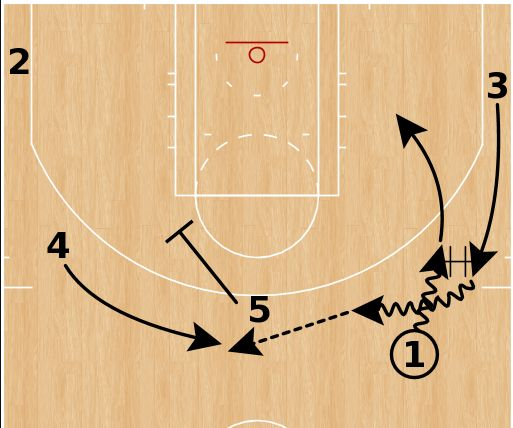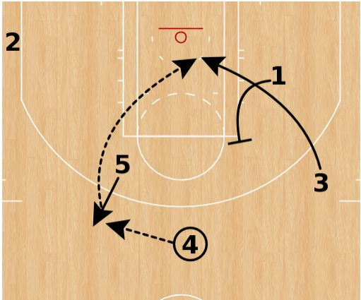 进攻开始之前,2号位和3号位球员埋伏在两个底角,1号位和5号位都在弧顶落位,4号位在45度角。进攻发起后,3号位向弧顶靠拢,和1号位完成手递手传球,同一时间5号位为4号位做掩护。等4号位摆脱防守到达弧顶之后,3号位立即把球传给他。