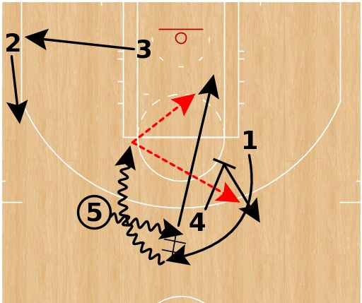 如果3号没有摆脱防守,那么5号位就把球交给1号位,这时4号位要为1号位做掩护,帮助自家控卫摆脱防守。1号位到达弧顶后,和5号位完成手递手传球。5号位传完球之后,他和4号位之间要有一个分工,一个往篮下空切,另一个去到3分线外,同一时间2号位移动到45度角,3号位去到底角。这个时段1号位要做决定,他可以选择自己进攻,也可以把球传给出现机会的4号位或者5号位。
