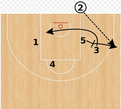 5名球员在场上的站位如下图所示。进攻开始后,3号位借助5号位的掩护往篮下空切,如果他成功摆脱防守,那就接球攻击篮筐,这是第一机会;如果3号位没跑出机会,那么5号位立即拉到右侧高位,接2号位的发球。