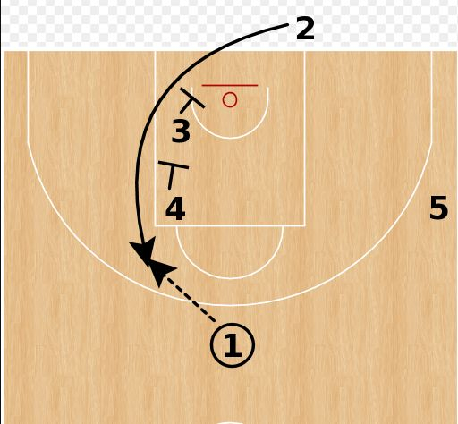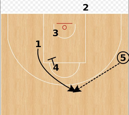 4号位为1号位做一个下掩护,1号位摆脱防守后来到弧顶接球。然后3号位来到左侧低位。