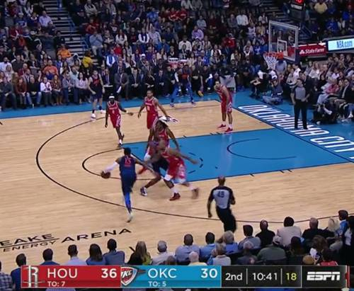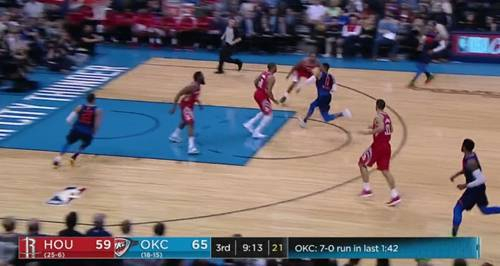 哈登、威少以个人能力展开对飙,辅以借挡拆突分连线外围的休斯蒂斯和阿里扎抢三分。